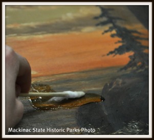 About 125 years ago, an artist with the initials “W.K” captured the eye level view of Arch Rock at sunrise on his canvas. For years the painting hung in Horn’s Gaslight bar on Mackinac Island. It was subject to decades of smoke, kitchen fumes and grime before being acquired by the Mackinac Island State Park Commission (www.mackinacparks.com). The painting had never been treated, and the heavy layer of grime disfigured the image.